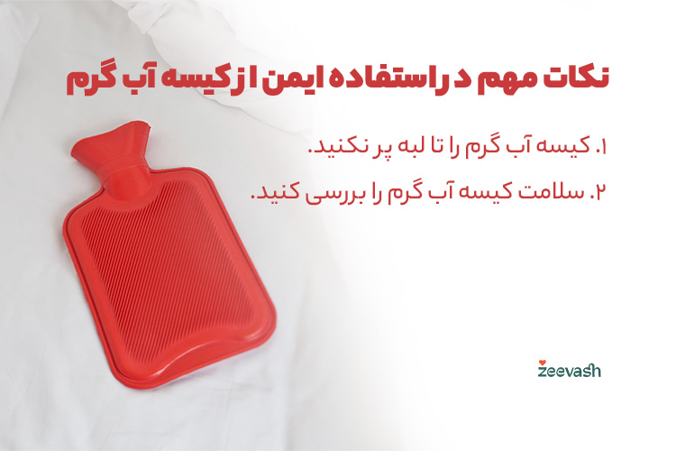 توجه داشته باشید کیسه آب گرم را به صورت موقتی روی ناحیه قرار دهید و هرگز با آن تا صبح نخوابید. به این دلیل که خطر ترکیدن یا نشت کیسه آب گرم وجود دارد. این موضوع اغلب به دلیل وارد آوردن فشار ناشی از وزن بدن رخ میدهد؛ بنابراین بعد از هر بار استفاده، کیسه آب گرم را از تختخواب بیرون ببرید.