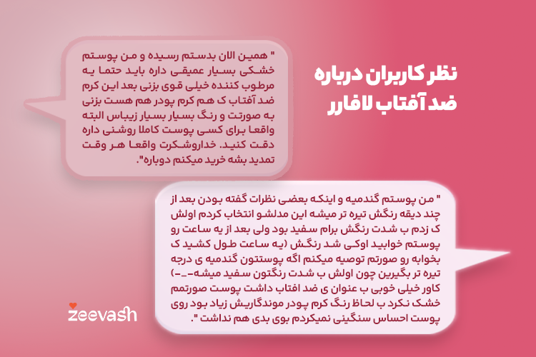 البته بعضی از کاربران نسبت به قیمت محصولات لافارر و میزان چربی آن نکاتی مطرح کردند. به نظر بعضی از کاربران، برای استفاده از انواع ضد آفتاب لافارر حتماً به استفاده از مرطوبکننده نیاز خواهید داشت که البته این مسئله نسبت به چربی پوست هر فرد، متغیر است. مثلاً یکی از کاربران درمورد ضد آفتاب رنگی پوست خشک لافارر، چنین نظری ثبت کرده است: