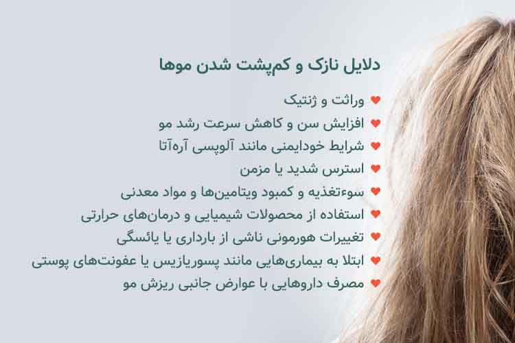 بسیاری از عوامل ممکن است در نازک و کمپشت شدن موها دخیل باشند. این دلایل گاهی ساده و قابل پیشگیریاند و گاهی هم به مداخله تخصصی نیاز دارند: